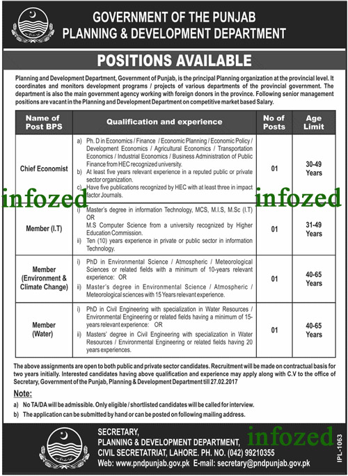Punjab Government Jobs Planning & Development Department, Punjab Government Jobs Planning & Development Department, Chief Economist, Member IT, Member Environment & Climate Change, Member Water